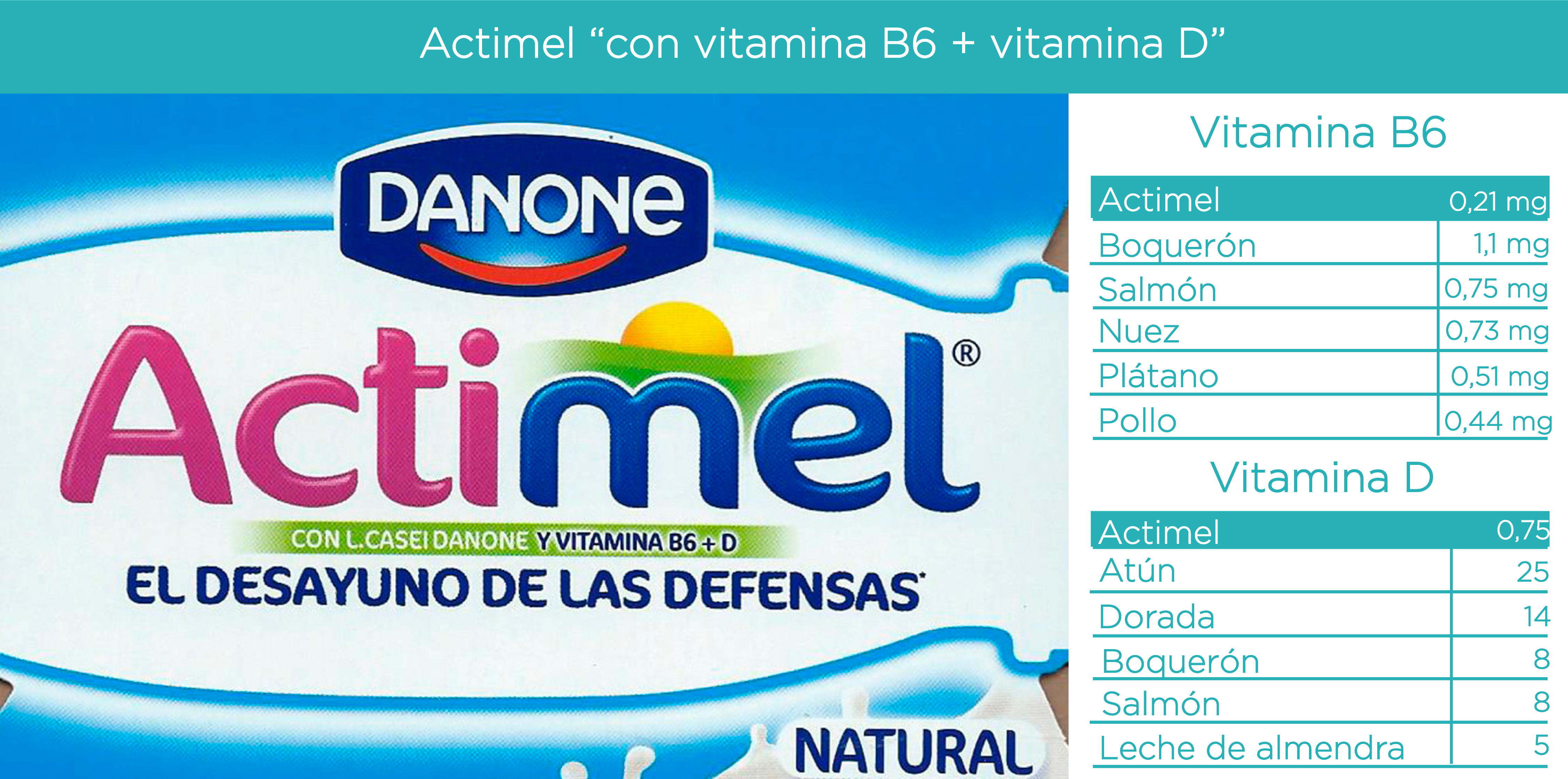 Conclusión: La cantidad de B6 o de vitamina D que contiene el actimel es la mínima exigida por la EFSA para poder señalar en dicho producto que puede “ayudar al normal funcionamiento del sistema inmunitario”. Esto no es más que un reclamo publicitario, y tal y como vemos en la siguiente tabla hay otros alimentos más clásicos (y más económicos) que son una mejor fuente de estos micronutrientes.