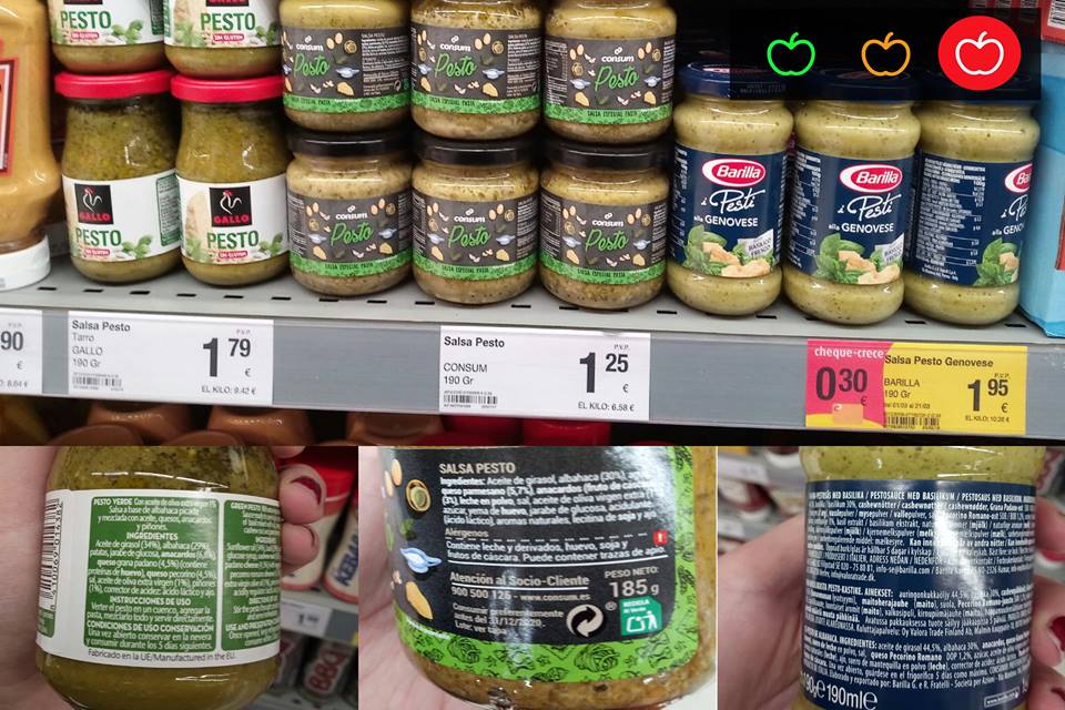 Hoy os traemos el ejemplo de la salsa Pesto, como vemos en la imagen tenemos marca consum (1,25 euros), gallina blanca (1,79 euros) y barilla (1,95 euros).