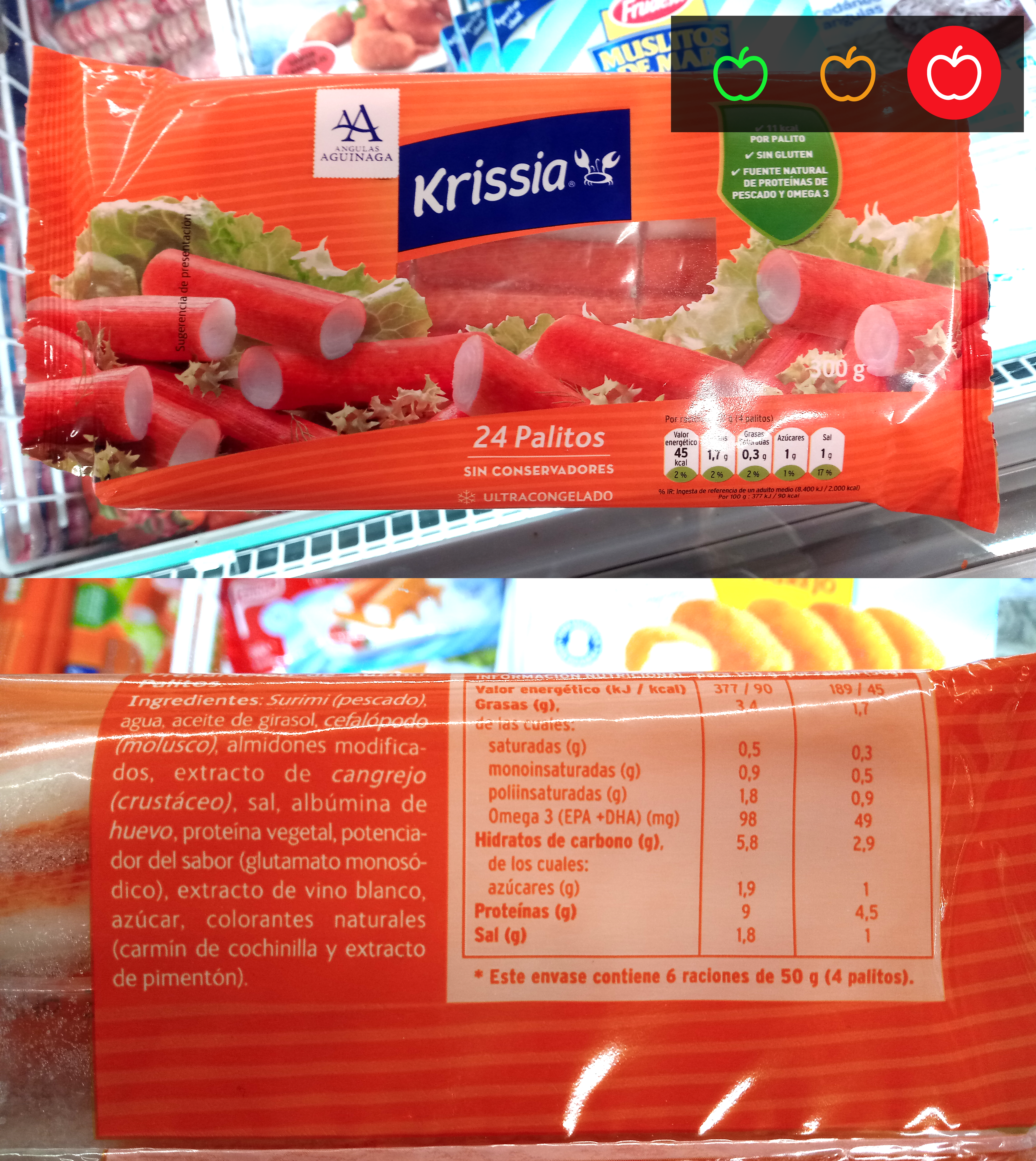 Lo que no te dicen: Su contenido en surimi no supera el 50% en la mayoría de las marcas. Krissia concretamente ya no especifica su porcentaje, aunque en 2011 era del 44%, podríamos pensar que es porque lo han aumentado, salvo por el pequeño detalle que han eliminado la palabra “cangrejo” en su publicidad dejando solo el nombre de la marca y “24 palitos”. Curioso, ¿verdad?